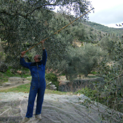 Familie unermüdlich im Olivenhain, um die empfindlichen Oliven in reiner Handarbeit einzubringen.